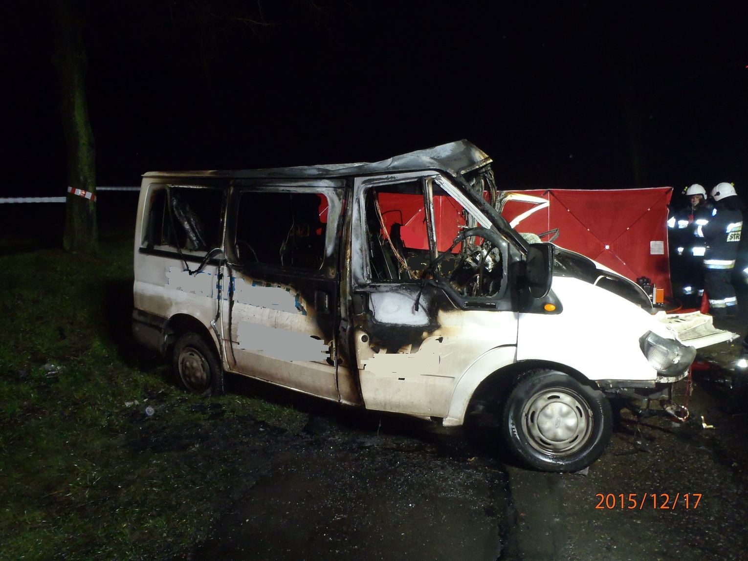 Po dojeździe pierwszego zastępu na miejscu zdarzenia samochód dostawczy marki Ford Transit, który uderzył w drzewo w całości się palił. Podjęte działania: zabezpieczenie oraz oświetlenie miejsca zdarzenia, podanie prądu gaśniczego na palące się auto. Po ugaszeniu pożaru na fotelu kierowcy odnaleziono ciało. Przybyły na miejsce zdarzenia lekarz ZRM Chodzież stwierdził zgon. Przy pomocy kamery termowizyjnej przeszukano teren w promieniu 100 metrów w celu wykluczenia możliwości uczestniczenia w zdarzeniu innych osób. Na prośbę Policji, która wykonała czynności dochodzeniowo-techniczne, ratownicy wykonali dostęp do wnętrza auta przy pomocy narzędzi hydraulicznych. Wrak samochodu został zabrany przez przybyłą na miejsce zdarzenia pomoc drogową.