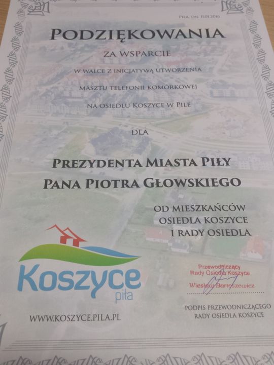 Prezydent przypomniał gościom, że wobec narastającego konfliktu pomiędzy Inwestorem, mieszkańcami oraz defensywnej postawy Starostwa Powiatowego, które było organem właściwym w zakresie wydania pozwolenia i budowy przez Polkomtel stacji bazowej telefonii komórkowej na Osiedlu Koszyce włączył się w proces, negocjując z Inwestorem rozwiązania alternatywne. Od kwietnia 2015 roku Urząd Miasta Piły kilka razy podejmował inicjatywy mające na celu pogodzenie interesów mieszkańców i Inwestora.