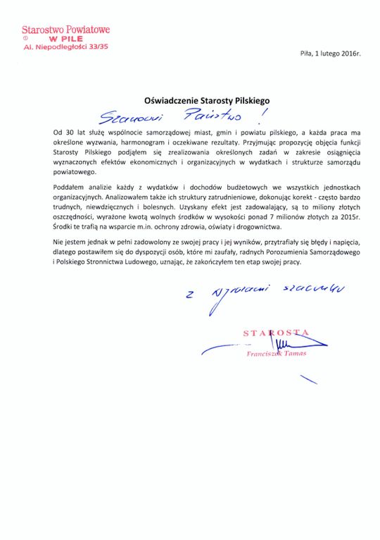 Od 30 lat służę wspólnocie samorządowej miast, gmin i powiatu pilskiego, a każda praca ma określone wyzwania, harmonogram i oczekiwane rezultaty. Przyjmując propozycję objęcia funkcji Starosty Pilskiego podjąłem się zrealizowania określonych zadań w zakresie osiągnięcia wyznaczonych efektów ekonomicznych i organizacyjnych w wydatkach i strukturze samorządu powiatowego.