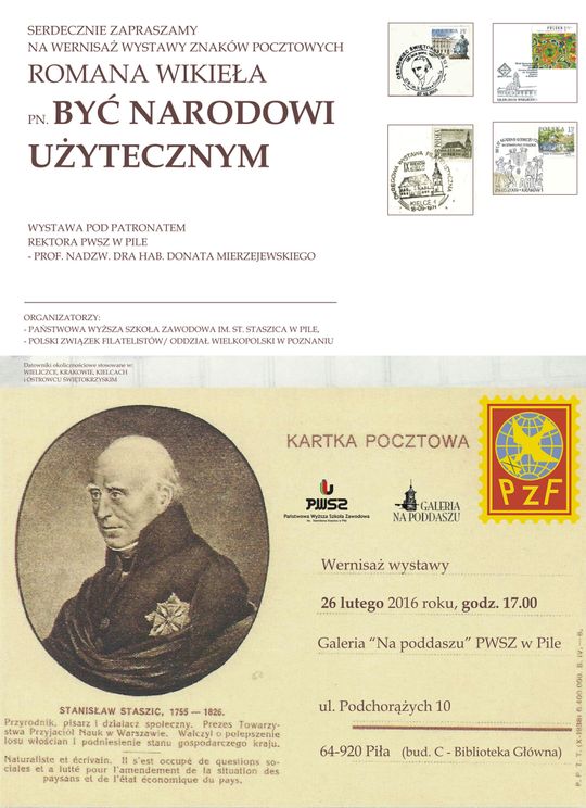 Serdecznie zapraszamy na wystawę znaków pocztowych autorstwa ROMANA WIKIEŁA pt. "Być narodowi użytecznym". Wernisaż wystawy odbędzie się 26 lutego o godz. 17.00 w Galerii "Na poddaszu" PWSZ w Pile (bud. C).