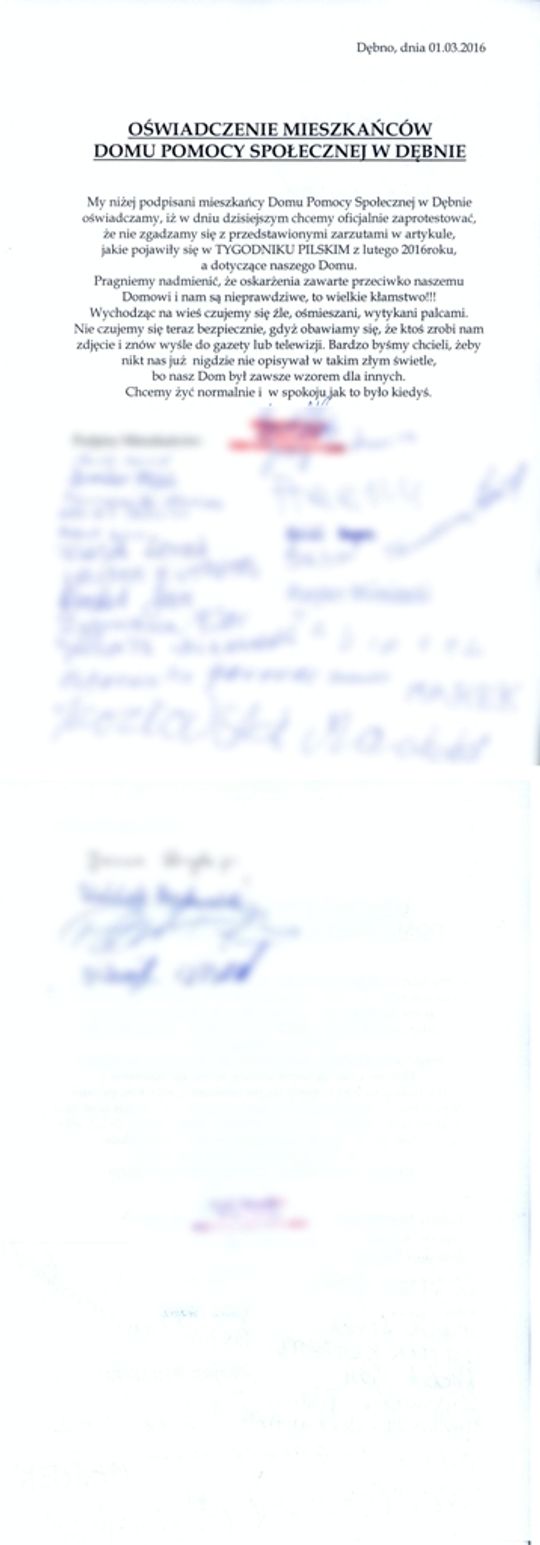 Z oświadczenia mieszkańców DPS Dębno: „oskarżenia przeciwko naszemu Domowi są nieprawdziwe, to wielkie kłamstwo!!! Wychodząc na wieś czujemy się źle, ośmieszani, wytykani palcami (…) Bardzo byśmy chcieli, żeby nikt nas już nigdzie nie opisywał w takim złym świetle, bo nasz Dom był zawsze wzorem dla innych. Chcemy żyć normalnie i w spokoju jak to było kiedyś”.