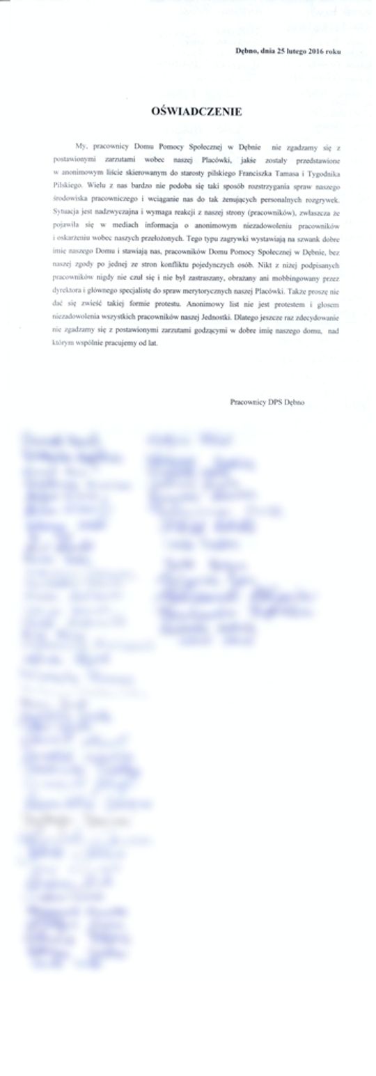 Z oświadczenia pracowników DPS Dębno: „Sytuacja jest nadzwyczajna i wymaga reakcji z naszej strony, zwłaszcza, że pojawiła się w mediach informacja o anonimowym niezadowoleniu pracowników i oskarżeniu wobec naszych przełożonych. Tego typu zagrywki wystawiają na szwank dobre imię naszego Domu i stawiają nas (…) bez naszej zgody po jednej ze stron konfliktu pojedynczych osób. Nikt z niżej podpisanych pracowników nie czuł się i nie był zastraszany, obrażany ani mobbingowany przez dyrektora i głównego specjalistę do spraw merytorycznych naszej Placówki. Także proszę nie dać się zwieść takiej formie protestu. Anonimowy list nie jest głosem niezadowolenia wszystkich pracowników naszej Jednostki. Dlatego jeszcze raz zdecydowanie nie zgadzamy się z postawionymi zarzutami godzącymi w dobre imię naszego domu, nad którym wspólnie pracujemy od lat”.