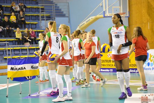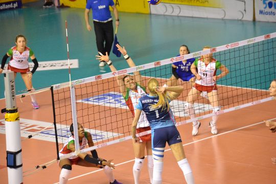 Pierwsza część premierowej odsłony meczu była wyrównana. Oba zespoły grały punkt za punkt. Chwilę przed przerwą skutecznie ze skrzydła zaatakowała Izabela Kowalińska (8:7). Po wznowieniu gry mistrzynie Polski przejęły inicjatywę na parkiecie. W tym fragmencie świetnie spisywały się w polu serwisowym. Między innymi Aleksandra Jagieło posłała na stronę rywalek dwa asy serwisowe (14:7). Gospodynie starały się jak mogły, żeby odrobić straty. Jednak policzanki cały czas kontrolowały wydarzenia na boisku. Jagieło skuteczną kiwką zakończyła pierwszego seta (25:18).
