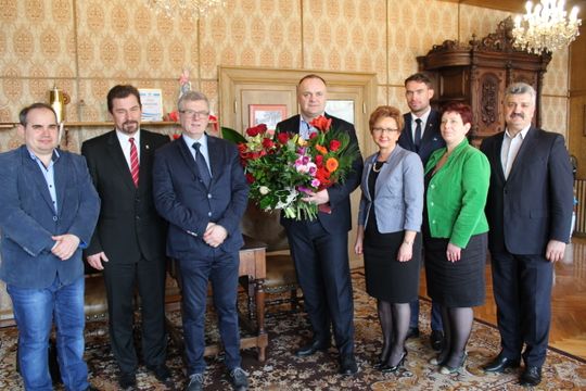 Burmistrzowie i wójtowie gmin powiatu pilskiego, po spotkaniu, przybyli z gratulacjami do starosty Eligiusza Komarowskiego. Gratulacje odebrał też wicestarosta Stefan Piechocki i etatowy członek zarządu Przemysław Pochylski.