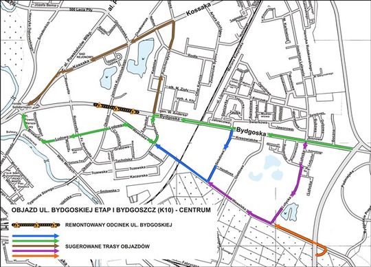 20 kwietnia, na czas przebudowy, zostanie zamknięty pas jezdni prowadzący do Śródmieścia. Ruch dozwolony będzie w jednym kierunku - w stronę wyjazdu na Bydgoszcz. Tak więc osoby które będą jechały z centrum w kierunku Bydgoszczy nie napotkają przeszkód w ruchu. Natomiast osobom udającym się w kierunku centrum miasta przedstawiamy mapkę z zalecanymi objazdami.