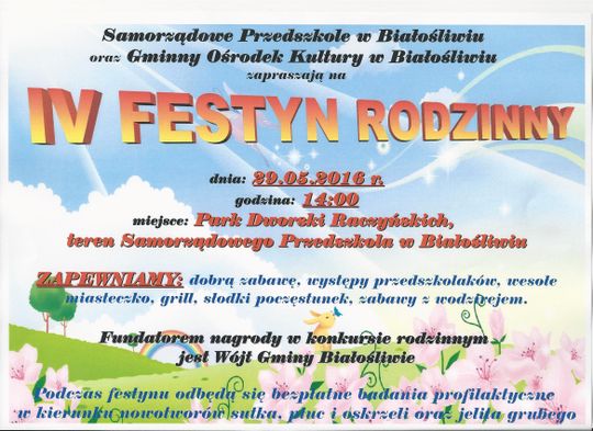 Natomiast w niedzielę 29 maja w godz. 14.00-18.00 ankiety zgłoszeniowe będą mogli złożyć mieszkańcy gminy Białośliwie, podczas IV Festynu Rodzinnego w Parku Dworskim Raczyńskich w Białośliwiu. Każda osoba, która zgłosi się na badanie otrzyma drobny upominek.