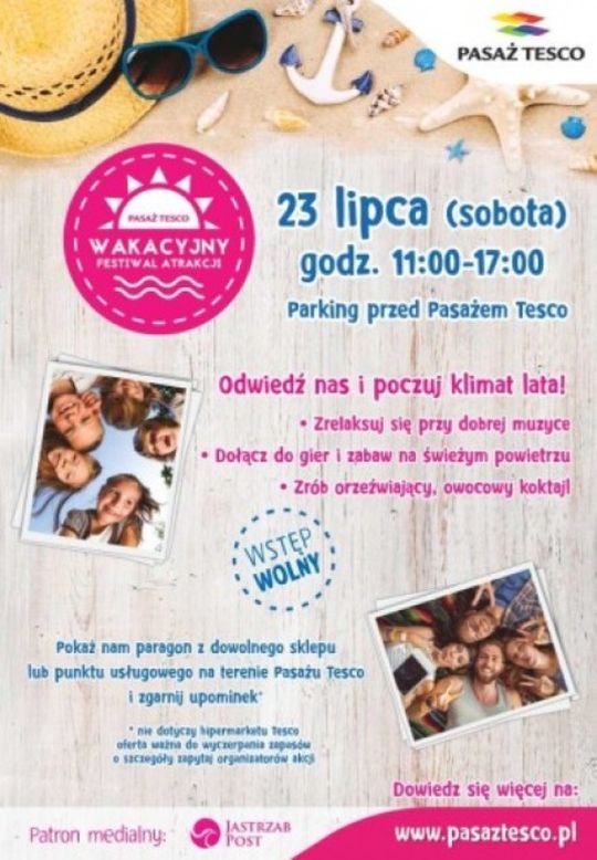 23 lipca na parkingu Pasażu Tesco przy ulicy Bydgoskiej 135 w Pile zorganizowane zostaną liczne atrakcje zarówno dla dzieci jak i dorosłych! Klienci zrelaksują się w letniej strefie przy dźwiękach dobrej muzyki, wezmą udział w grach i zabawach razem z animatorami oraz jadąc na rowerach przygotują orzeźwiający, owocowy koktajl. Wakacyjna strefa to również świetna alternatywa dla osób, które potrzebują chwili relaksu w czasie sobotnich zakupów! Dla nich również przewidziane są niespodzianki! Każdy, kto w godzinach od 11: 00 do 17: 00 zrobi zakupy w dowolnym sklepie lub punkcie usługowym w Pasażu Tesco i przyjdzie do letniej strefy z paragonem, otrzyma wakacyjny gadżet. Otrzymać można między innymi: leżaki, kolorowe kubki na zimne napoje, czy izotermiczne worki na plecy. Im większa kwota na paragonie, tym bardziej atrakcyjny upominek!