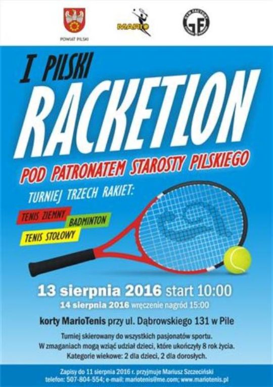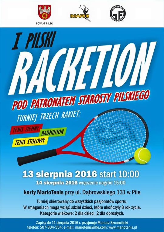 I Pilski Racketlon pod patronatem Starosty Pilskiego odbędzie się 13 i 14 sierpnia na kortach tenisowych przy ul. Dąbrowskiego 131 w Pile. Sobotnie gry rozpoczną się o 10:00. Zakończenie turnieju przewidziano na niedzielę (godz. 15:00). Więcej szczegółów pod numerem telefonu 507 804 554. Serdecznie zapraszamy!
