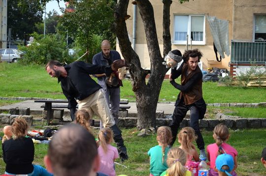Dla teatru ALATYR ta dobrze znana powieść płaszcza i szpady Alexandra Dumasa, stała się pretekstem do cofnięcia się w czasy dzieciństwa, gdzie naszymi miejscami zabaw nie były wzgórza XVI-wiecznego Paryża, ale podwórka z kilkoma drzewami, piaskownicą i pordzewiałym trzepakiem. Zaledwie dwóch aktorów: Bartosz Budny, Michał Karczewski, odgrywało aż osiemnaście postaci. Żadnego z ważnych bohaterów powieści A. Dumasa nie zabrakło na podwórkach. Pojawili się rzecz jasna, muszkieterowie, D’Artagnan i jego Konstancja, Ludwik XIII i królowa Anna Austriaczka, żądny władzy Richelieu, kawalerzyści, karczmarze i wielu, wielu innych. Do tego muzyka grana na żywo na tuzinie instrumentów przez Pawła Klicę – wystarczyły by stworzyć wciągające przedstawienie. W opowieści o tym jak dzielny d’Artagnan usiłuje zostać jednym z królewskich muszkieterów kryła się pochwała zabawy i wyobraźni, ale i także historia o lojalności względem przyjaciół i tęsknota za czasami zabaw podwórkowych.