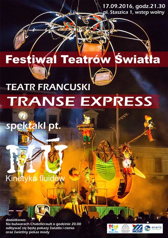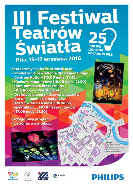 W ramach Festiwalu Teatrów Światła, w dniach 15-17 września 2016 roku na wszystkich mieszkańców Piły i okolic czekać będzie mnóstwo atrakcji m.in. iluminacje na wybranych budynkach Piły, Hue Room, uliczka parasolek Braci Philips, konkurs videomappingu i wiele innych (m.in.tereny Placu Konstytucji 3 Maja, ul. 11 Listopada, bulwary nad Gwdą, Plac Staszica). W sobotę 17 września w godzinach wieczornych na Placu Konstytucji odbędzie się przedstawienie Teatru Transe Express.