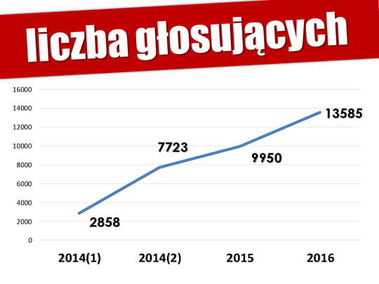 W głosowaniu wzięła udział rekordowa liczba uczestników – 13585 osób, którzy łącznie oddali 61456 głosów. Jest to ponad 22% uprawnionych do udziału w konsultacjach.