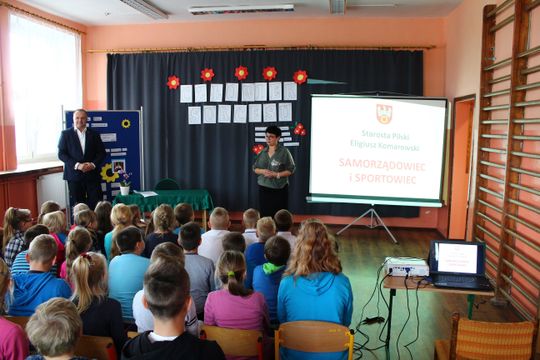- Wizyta pana starosty miała kilka punktów kulminacyjnych. Najważniejsze było spotkanie z dziećmi, podczas którego nasz gość opowiadał o karierze samorządowej i wciąż trwającej przygodzie ze sportem. Później, już na poważnie, pan starosta rozmawiał z nauczycielami o niejasnej sytuacji w oświacie i problemach trapiących szkoły – informuje Zuzanna Kochaniec, dyrektor placówki w Bądeczu, która wkrótce otrzyma godnego patrona: Polskich Olimpijczyków.