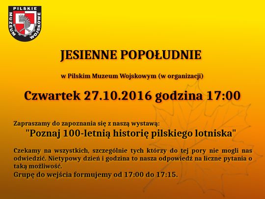 Wszystkich zainteresowanych zapraszamy w czwartek 27.10.2016 r. na godzinę 17:00 do schronohangaru nr 5 - siedziby Pilskiego Muzeum Wojskowego. Wskazówki bezpiecznego dojazdu na naszej stronie internetowej www.pila.fortyfikacje.pl