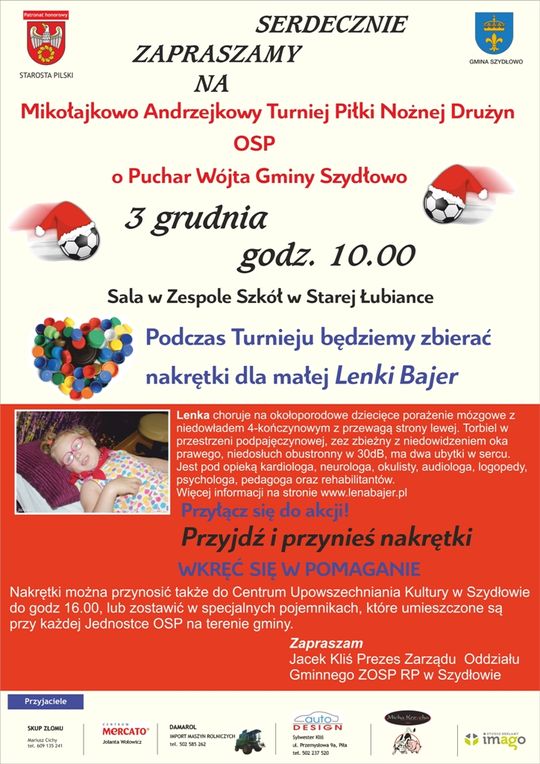 Turniej odbędzie się 3 grudnia (sobota) w sali sportowej Zespołu Szkół w Starej Łubiance. Początek rozgrywek o godz. 10.00. Nakrętki dla Lenki można przynosić tego dnia do godz. 16.00 również do Centrum Upowszechniania Kultury w Szydłowie oraz zostawiać w specjalnych pojemnikach umieszczonych przy każdej jednostce OSP na terenie gminy Szydłowo.