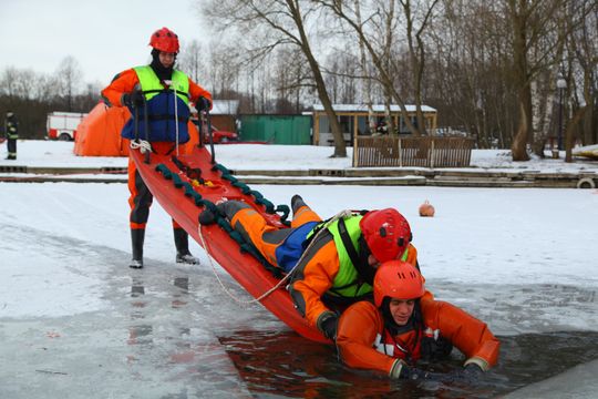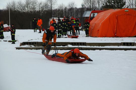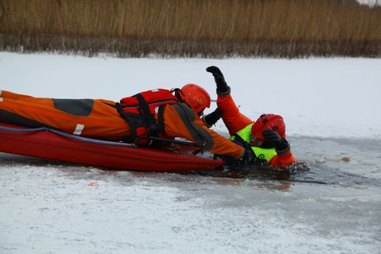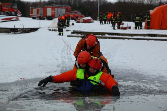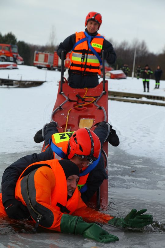 - Drugi moduł szkoleniowy dotyczył wykorzystania w praktyce sprzętu ratowniczego przez jednostki OSP i PSP w postaci deski lodowej oraz ubrań specjalnych do pracy w wodzie. Ratownicy zarówno na brzegu oraz obsługujący bezpośrednio sanie lodowe doskonalili swoją wiedzę i umiejętności w zakresie poszczególnych etapów trwającej kilkadziesiąt sekund akcji ratowniczej na lodzie.