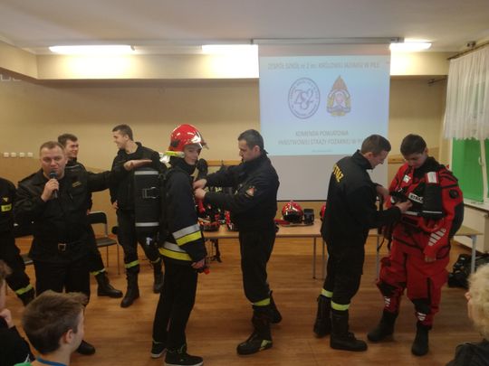 W trackie wizyty w szkole zaprezentowany został sprzęt ratowniczy jaki znajduje się na wyposażeniu pilskich strażaków oraz film edukacyjny pt: „Pożar komina”, dostępny na stronie www.pila.psp.wlkp.pl . Na zakończenie każdy uczestnik otrzymał ulotki informacyjne dotyczące zagrożeń związanych z sezonem grzewczym, a w szczególności zagrożeń powodowanych przez tlenek węgla potocznie zwanym „cichym zabójcą”.