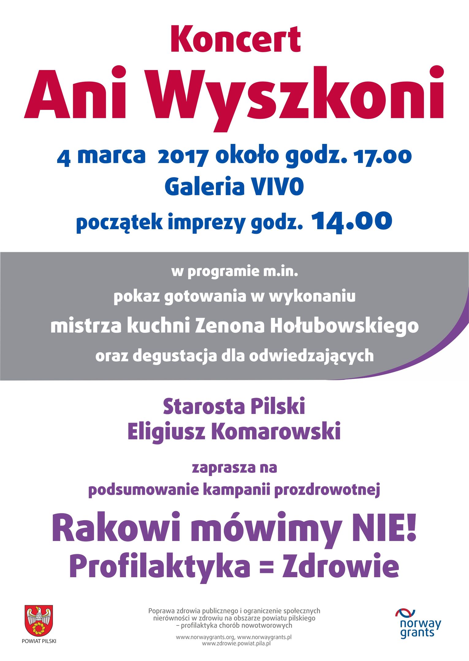 Kampania prozdrowotna Powiatu Pilskiego „Rakowi mówimy NIE. Profilaktyka=Zdrowie” realizowana jest w ramach programu poprawy zdrowia publicznego, finansowanego ze środków Norweskiego Mechanizmu Finansowego 2009-2014 i budżetu państwa.