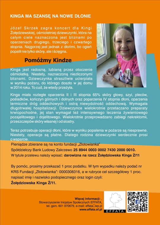 Józef Skrzek wystąpi dla Kingi Żołędziewskiej, ośmioletniej dziewczynki, która na całym ciele naznaczona jest bliznami po oparzeniach drugiego, trzeciego i czwartego stopnia. Najgorzej jest jednak z dłońmi, bo ogień popalił nie tylko skórę, ale i ścięgna.