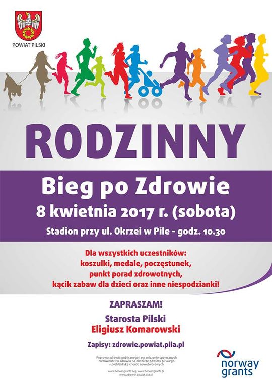 Bieg odbędzie się w ramach programu poprawy zdrowia publicznego realizowanego przez Powiat Pilski ze środków Norweskiego Mechanizmu Finansowego i budżetu państwa. Dorośli biegać będą na dystansie 5 km, kijkarze na trasie ok. 3 km (boisko boczne), a dzieci jedno okrążenie wokół stadionu. Dla uczestników: koszulki, medale, poczęstunek, punkt porad zdrowotnych, kącik zabaw dla dzieci