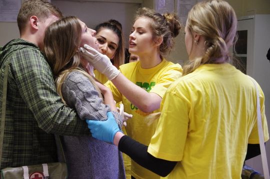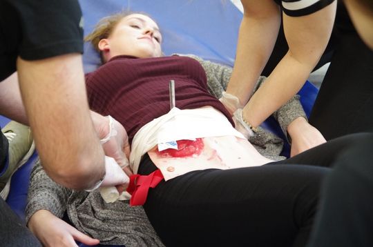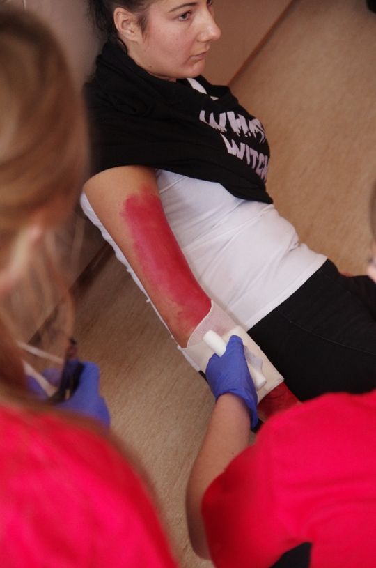 Po części teoretycznej, nadszedł czas na praktykę. Na zawodników czekało 5 scenek, przygotowanych przez wykładowców i studentów Instytutu Ochrony Zdrowia PWSZ w Pile. Uczniowie musieli zmierzyć się m.in. z poparzeniami kończyn górnych, z zadławieniem u ciężarnej kobiety, z nożem w brzuchu, z raną głowy. Zadania do łatwych nie należały, tym bardziej, że zespół sędziowski oceniał każdy etap postępowania – od zapoznania się z raną, zastosowania odpowiednich metod udzielenia pomocy, wykonywania opatrunków – po rozmowę z poszkodowanym.