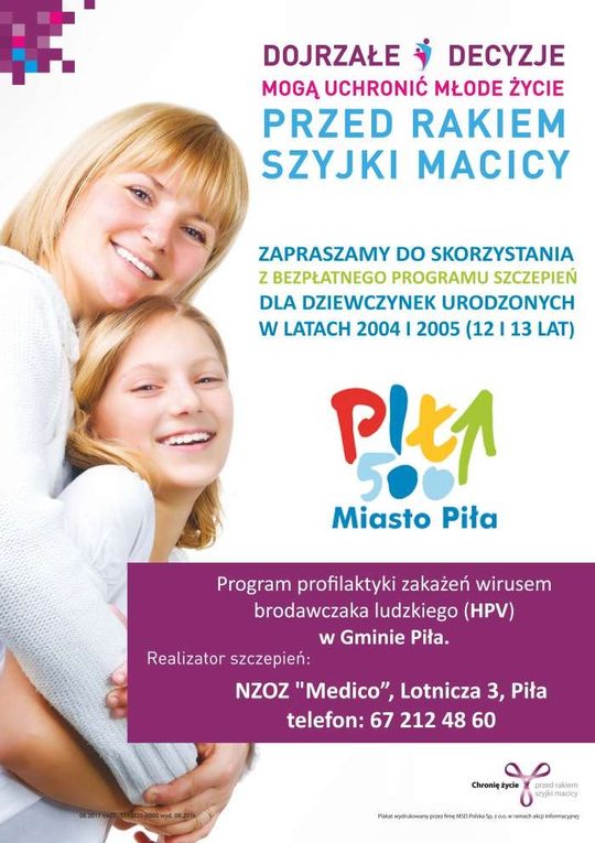 Ze szczepień mogą skorzystać dziewczynki uczęszczające do szkół w Pile (nie muszą być one zameldowane w gminie Piła). Liczba miejsc jest ograniczona – w 2017 roku zabezpieczona środki finansowe na szczepienie około 360 dziewczynek. Zapisy trwają do 12.05.2017 r. Zapisywać można się w szkole lub bezpośrednio w przychodni „Medico” Adam Gronowski, ul. Lotnicza 3 w Pile. W przypadku wyczerpania miejsc dziewczynki zapisane w 2017 roku będą mogły skorzystać z bezpłatnych szczepień w 2018 r.