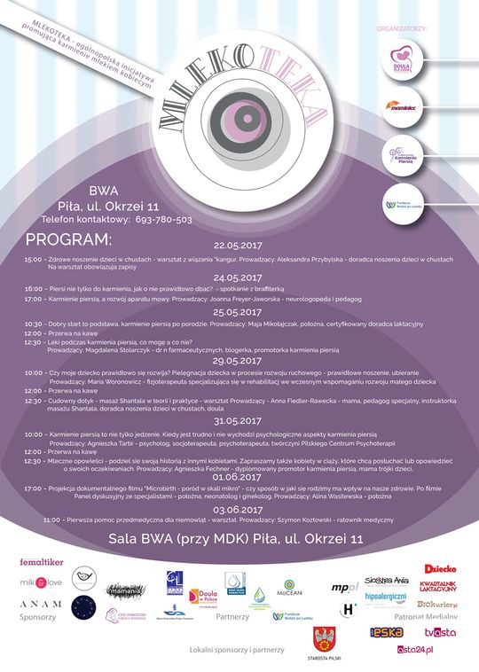 Akcja Mlekoteka to doskonała okazja, aby zaczerpnąć rzetelnej wiedzy z różnych dziedzin bliskich rodzicielstwu oraz spotkać się z innymi mamami. Spotkania i warsztaty odbywać się będą w sali BWA przy ul. Okrzei 11, przy Młodzieżowym Domu Kultury w Pile. Szczegółowy harmonogram akcji dostępny jest na plakatach, profilu facebookowym @MamillaWspiera oraz @Mlekoteka w wydarzeniach oraz na stronie internetowej www.mamilla.pl