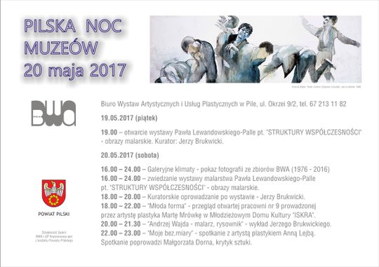 Co jeszcze? Z pewnością warto pochylić się nad propozycjami pilskiego Biura Wystaw Artystycznych i Usług Plastycznych, które przygotowało szereg atrakcji w ramach tegorocznej Nocy Muzeów. W piątek o 19:00 nastąpi otwarcie wystawy obrazów malarskich Pawła Lewandowskiego – Palle „Struktury współczesności”. Z kolei w sobotę od 16:00 do 24:00 będzie można równolegle korzystać z oferty BWA i uczestniczyć w przeglądzie „Młoda forma”, którą po sąsiedzku, w Młodzieżowym Domu Kultury, w ramach jednej z pracowni, prowadzi na co dzień Marta Mrówka.