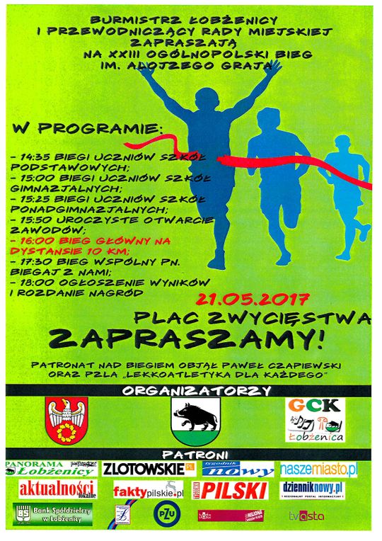 Rzecz jasna, powiat to nie tylko Piła, dlatego miłośników ruchu gorąco zapraszamy do Łobżenicy, gdzie w niedzielę o 16:00 rozpocznie się XXIII Ogólnopolski Bieg im. Alojzego Graja. Można przypuszczać, że trzeci etap cyklu „Biegaj z nami” zgromadzi na starcie ponad 200 osób i będzie wspaniałym przeżyciem dla wszystkich uczestników.