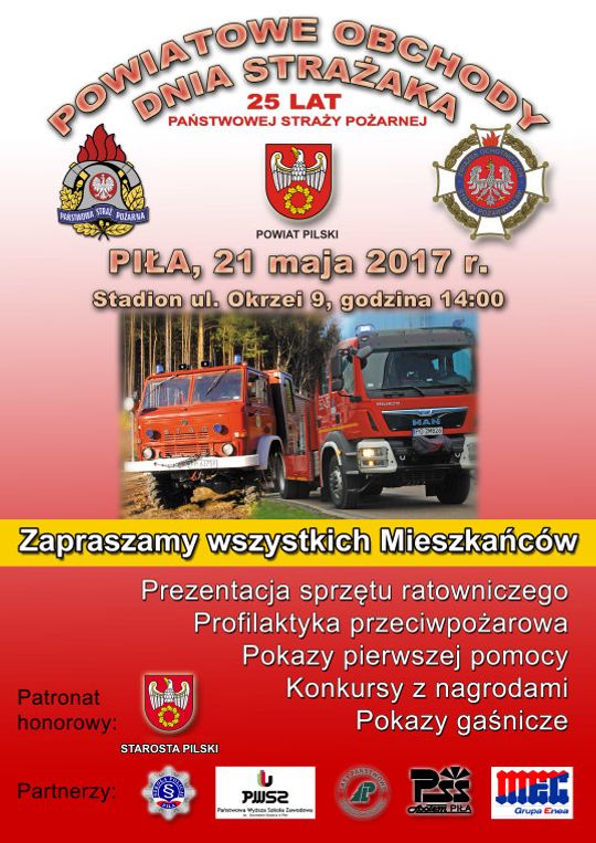 Zacznijmy od końca. W niedzielę, 21 maja o godz. 14:00 na stadionie przy ul. Okrzei w Pile rozpocznie się okolicznościowy piknik z okazji Powiatowych Obchodów Dnia Strażaka. W ramach spotkania przewiduje się między innymi prezentacje sprzętu ratowniczego, pokazy pierwszej pomocy, pokazy gaśnicze oraz konkursy z nagrodami. – Uroczystość ma szczególny wymiar, ponieważ uświetnia obchody 25-lecia istnienia Państwowej Straży Pożarnej. Całość zainaugurujemy galą w Młodzieżowym Domu Kultury, po czym dotrzemy na stadion, gdzie odbędzie się spotkanie ze strażakami w rolach głównych. Serdecznie zapraszam na to radosne świętowanie, wspólnie przygotowaliśmy wiele atrakcji. Zależy nam, żeby stadion na Okrzei, którym zarządza Powiat Pilski, coraz bardziej służył mieszkańcom. Niedawno zaczęliśmy prace służące jego rewitalizacji – informuje Eligiusz Komarowski, starosta pilski i patron obchodów.