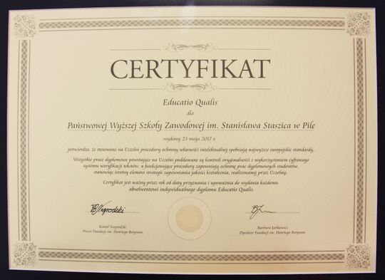 W gronie wyróżnionych uczelni, oprócz PWSZ w Pile, znalazły się: Szkoła Główna Handlowa, Uniwersytet Ekonomiczny w Krakowie oraz Akademia Pomorska w Słupsku. Certyfikat odebrał prof. nadzw. dr inż. Bolesław Ochodek - Pełnomocnik Rektora ds. Jakości Kształcenia.