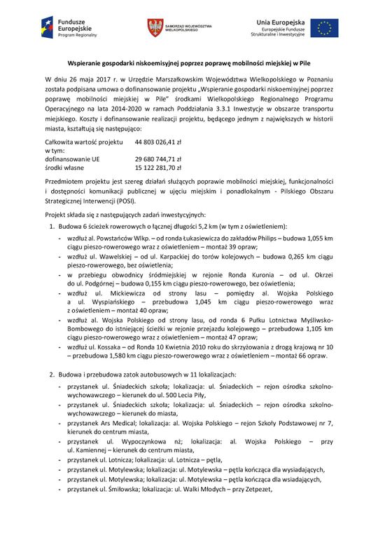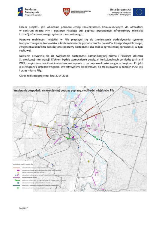 Celem projektu jest obniżenie poziomu emisji zanieczyszczeń komunikacyjnych do środowiska w centrum miasta Piły poprzez przebudowę infrastruktury miejskiej i rozwój zrównoważonego systemu transportowego. Poprawa mobilności miejskiej w Pile przyczyni się do zmniejszenia oddziaływania systemu transportowego na otoczenie, wzmocni powiązania funkcjonalne pomiędzy gminami POSI. Projekt realizowany będzie do końca 2018 r.