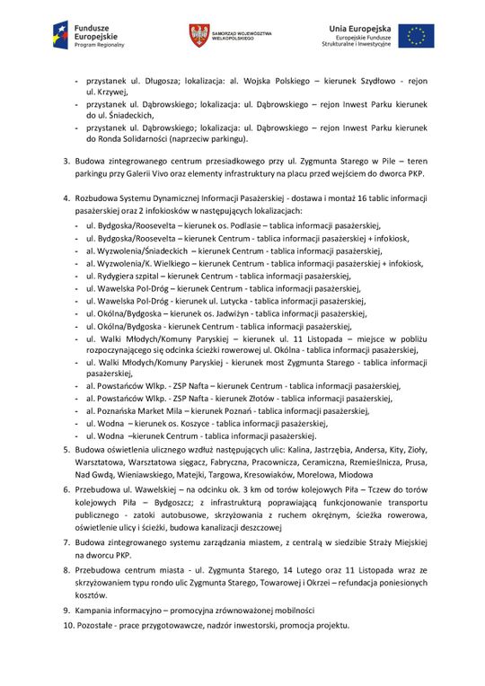 Przedmiotem projektu jest szereg działań służących poprawie mobilności miejskiej, funkcjonalności i dostępności komunikacji publicznej w ujęciu miejskim i ponadlokalnym - Pilskiego Obszaru Strategicznej Interwencji (POSI).