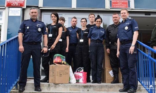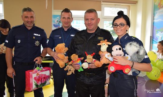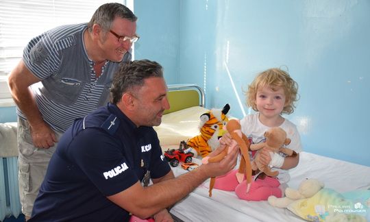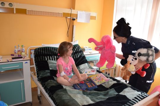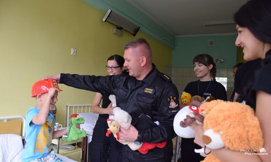 Funkcjonariusze przekazali najmłodszym pacjentom kolorowe pluszaki, które dzieci policjantów i strażaków przyniosły na piknik rodzinny pod koniec maja br. Podczas spotkania dodatkowo mundurowi w szpitalnej świetlicy zorganizowali wspólne zabawy. Zaskoczone tak miłą niespodzianką dzieci nie kryły radości. Mamy nadzieję, że czas spędzony z funkcjonariuszami, pozwolił choć na chwilę zapomnieć małym pacjentom o codziennych zmaganiach z chorobą. Podczas trwania wizyty na twarzach dzieci bardzo często można było zauważyć uśmiech, co w opinii mundurowych było dla nich największą nagrodą.