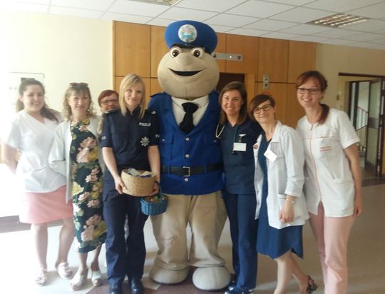 A kilka dni wcześniej, Sierżant Pyrek odwiedził najmłodszych pacjentów przebywających na oddziale dziecięcym w Szpitalu Specjalistycznym w Pile. Maskotce Wielkopolskiej Policji towarzyszyli policjanci z Komendy Powiatowej Policji w Pile. W trakcie wizyty policjanci przypomnieli podstawowe zasady bezpieczeństwa obowiązujące nie tylko na drodze, ale także w domu, na podwórku, czy podczas pobytu nad wodą. Spotkanie miało również pomóc w wykształceniu właściwych postaw i mechanizmów obronnych wobec istniejących zagrożeń takich jak przemoc rówieśnicza, uzależnienia, czy też kontakty z osobami obcymi.