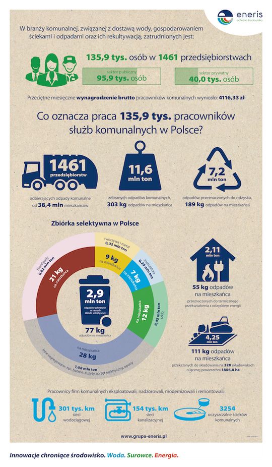 Według danych GUS, w roku 2016 zebrano w Polsce 11 654,4 tys. ton odpadów komunalnych, co oznacza 303 kg na mieszkańca. W ramach zbiórki selektywnej zebrano 2 942 tys. ton odpadów (77 kg per capita). Do odzysku przeznaczono 7 247,7 tys. ton (189 kg per capita), a 3 243,5 tys. ton (84 kg per capita) przeznaczono do recyklingu. Na 320 składowisk o łącznej powierzchni 1 806,8 ha zdeponowano 4 254,7 tys. ton odpadów (111 kg per capita). 2 114,4 tys. ton (55 kg per capita) skierowano do procesów termicznego odzysku, przeprowadzanych m.in. w Instalacjach Termicznego Odzysku Odpadów, w elektrociepłowniach i cementowniach. W sektorze usług komunalnych znalazło zatrudnienie 135,9 tys. osób w 1 461 przedsiębiorstwach – publicznych i prywatnych. Przeciętne wynagrodzenie brutto w sektorze wyniosło 4 116,33 zł.