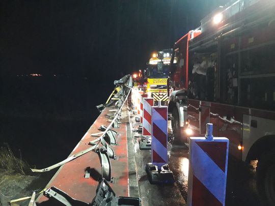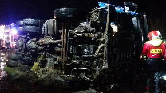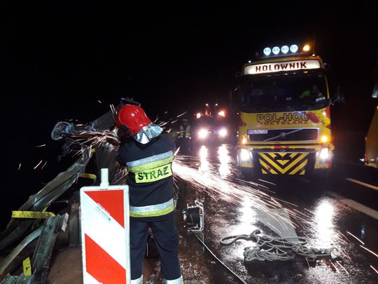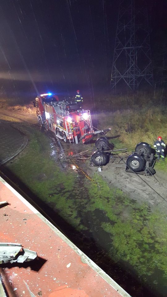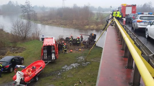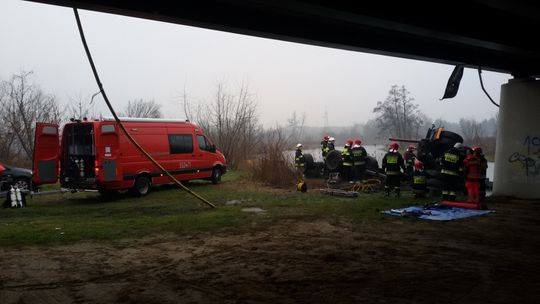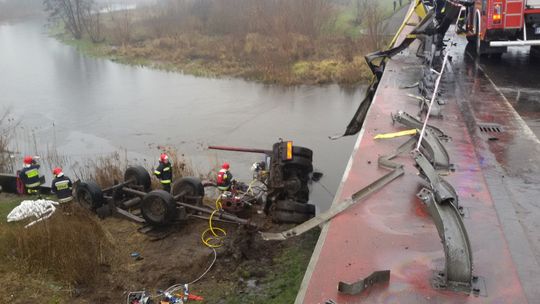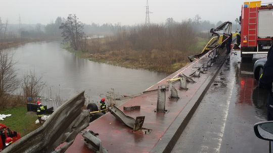 Na miejscu zdarzenia stwierdzono że samochód ciężarowy służący do przewozu drewna przebił barierki na moście i spadł z wysokości