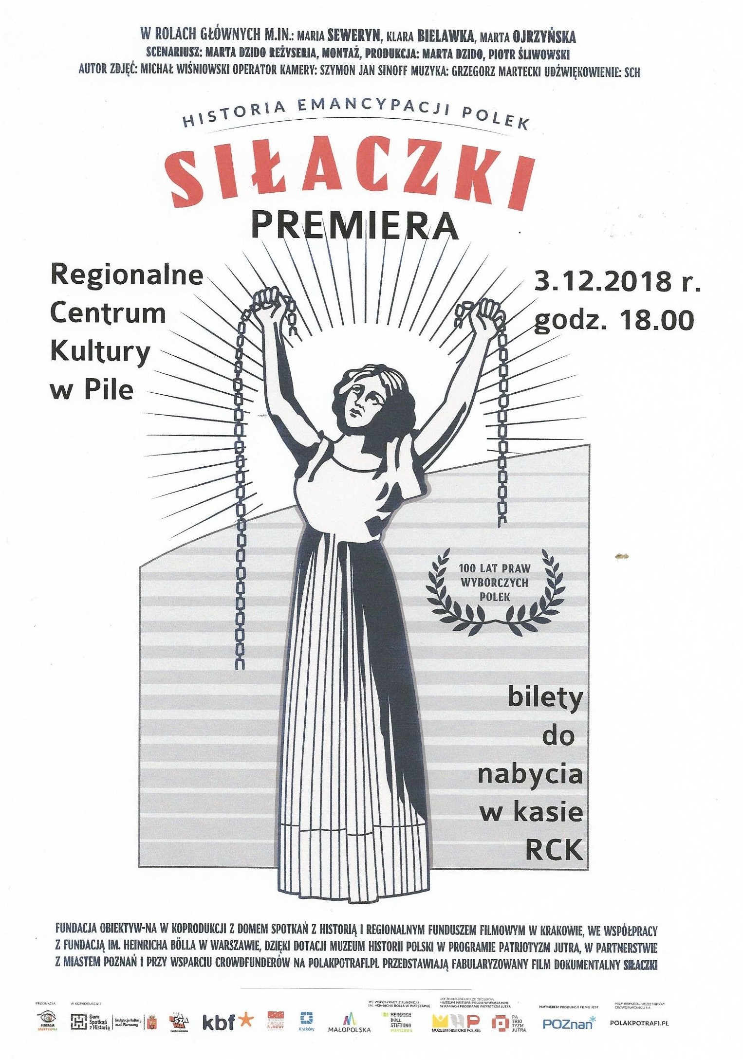 zapraszamy 3 grudnia 2018 r. o godz. 18.00 do Regionalnego Centrum Kultury w Pile na przedpremierowy pokaz fabularyzowanego dokumentu o polskich sufrażystkach pt. "Siłaczki".