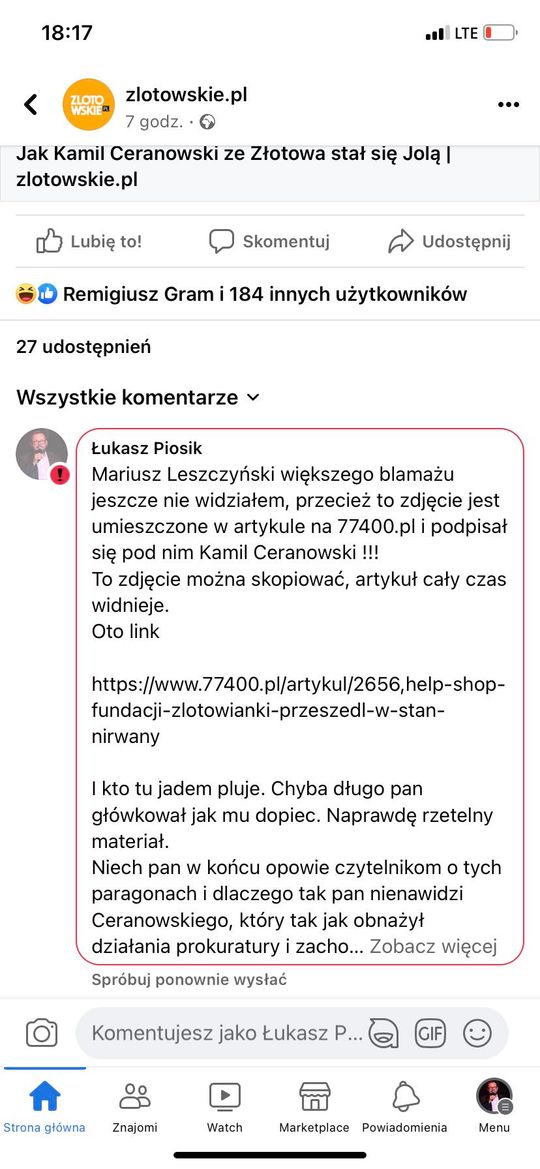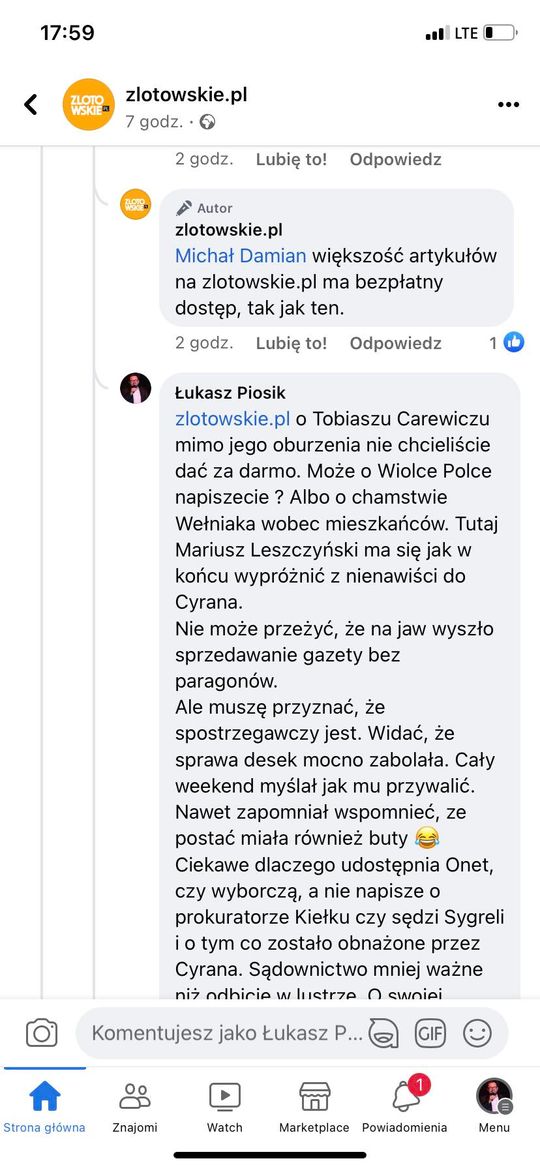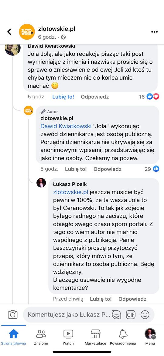 Łukasz Piosik o usuwaniu komentarzy, blokowaniu dostępu do wypowiedzi oraz nieudanej prowokacji Redaktora Naczelnego Aktualności Lokalnych i portalu zlotowskie.pl Mariusza Leszczyńskiego.