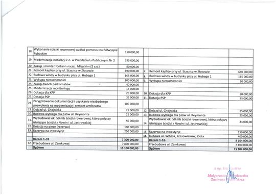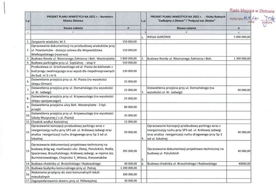 Swoje propozycje mają także radni klubów "Zadbajmy o Złotów" oraz "Połączył nas Złotów". Tu zadań inwestycyjnych jest znacznie mniej, bo tylko 16. Wśród nich znajdują się m.in. budowa ronda przy ul. Nieznanego Żołnierza i Bohaterów Westerplatte, remont kaplicy przy ul. Staszica w Złotowie, ale także wkład w kwocie aż 5 mln zł do MZWiK.
