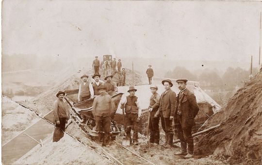 Zdjęcie, które zostało wykonane ze szczytu nasypu, tuż przed przęsłem mostu. W tle widoczny jest wąskotorowy parowóz budowlany, ciągnący za sobą lorki – charakterystyczne wagony towarowe, używane podczas budowy.