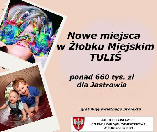 - Dzięki dofinansowaniu z Urzędu Marszałkowskiego Województwa Wielkopolskiego w kwocie ponad 660 tysięcy złotych, w ramach wsparcia aktywności zawodowej osób wyłączonych z rynku pracy z powodu opieki nad małymi dziećmi, w TULISIU powstanie 15 nowych miejsc opieki nad dziećmi, a dotacja zapewni ich funkcjonowanie przez 22 miesiące - poinformował Jacek Bogusławski, członek zarządu województwa wielkopolskiego.