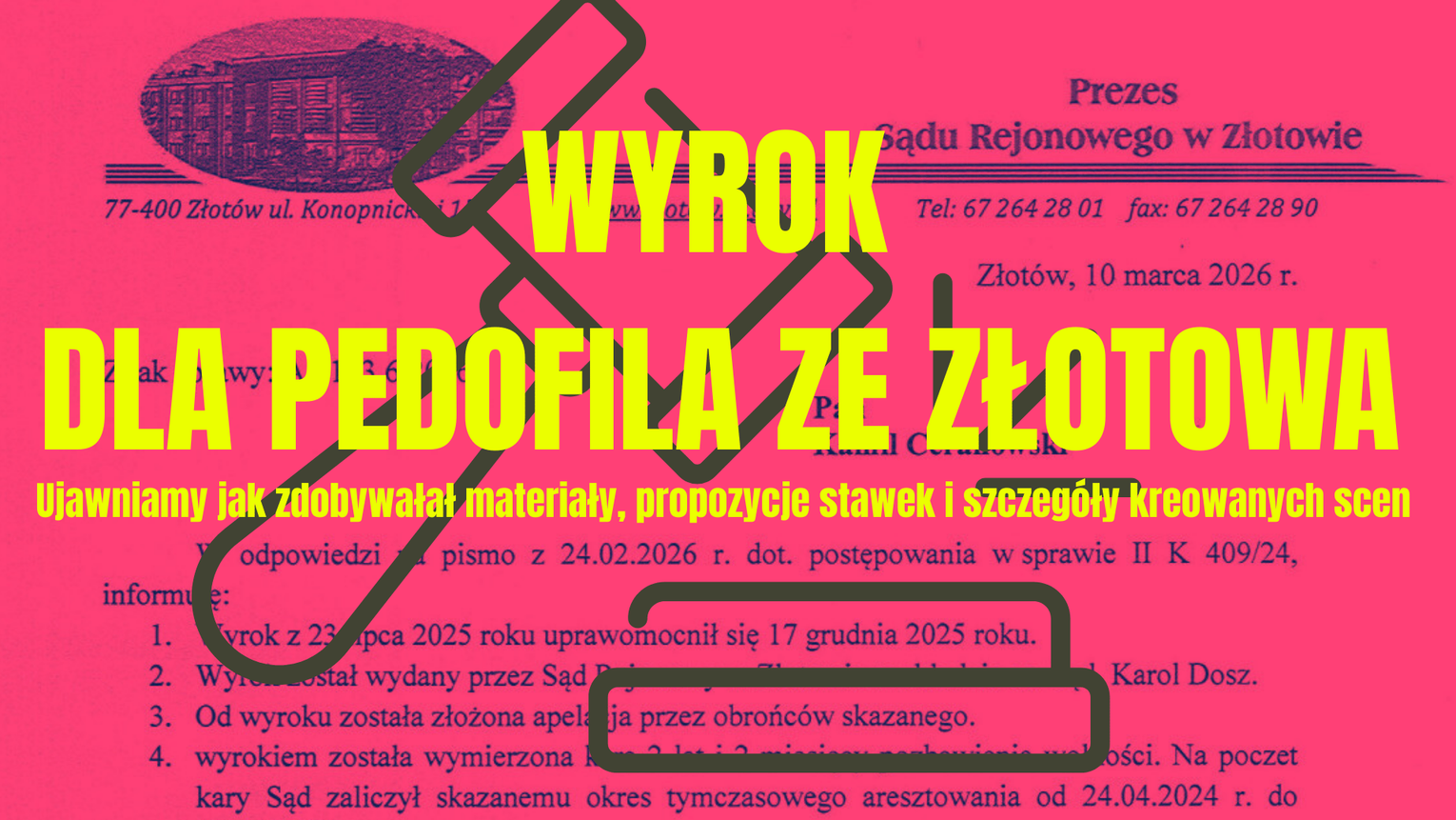 Sprawa trafiła do Sądu Rejonowego w Złotowie pod sygnaturą II K 409/24. Prezes Sądu Rejonowego w Złotowie Sędzia Tomasz Wałczuk potwierdził w piśmie z 10 marca 2026 r. do naszej redakcji prawomocność wyroku zapadłego 23 lipca 2025 r. przez asesora Karola Dosza jako prawomocny od 17 grudnia 2025 r. po apelacjach obrońców.