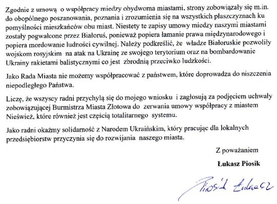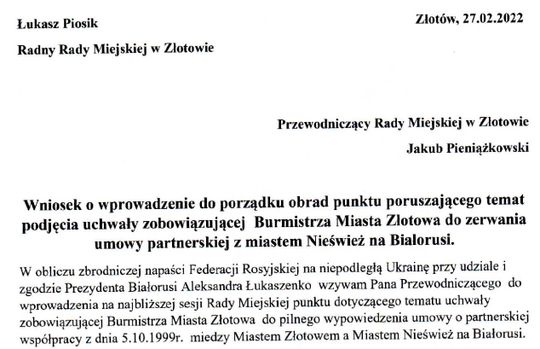 Kontakt do miasta partnerskiego jest utrudniony. Trudno poznać stanowisko władz Nieświeża, choć należy się spodziewać, że jest ono niezmienne i spójne z reżimem okupanta z Rosji. Niemniej należy mieć nadzieję, że zerwanie umowy uświadomi działaczom samorządowym oraz mieszkańcom Nieświeża, że dzieje się coś, czego my mieszkańcy Złotowa nie akceptujemy!