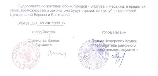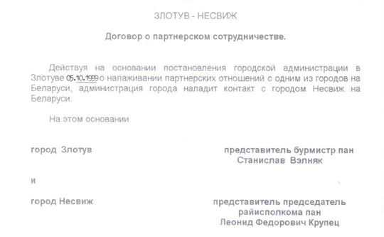 Umowa partnerska pomiędzy Złotowem a Nieświeżem została podpisana 05 10 1999 r. przez Burmistrza Złotowa Stanisława Wełniaka. W ramach umowy miasta zadeklarowały współpracę oraz wymianę doświadczeń na płaszczyźnie m. in. gospodarki, nauki, edukacji, kultury. Dokumenty poświadczające podpisanie umowy dostepne są w załączniku do artykułu w formacie PDF.