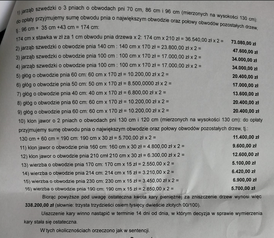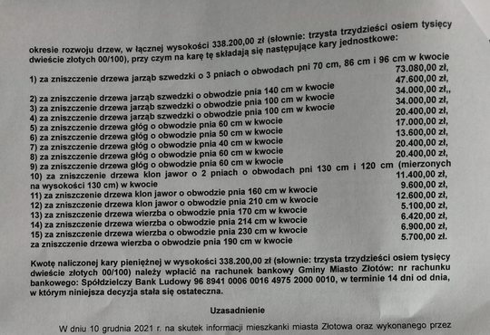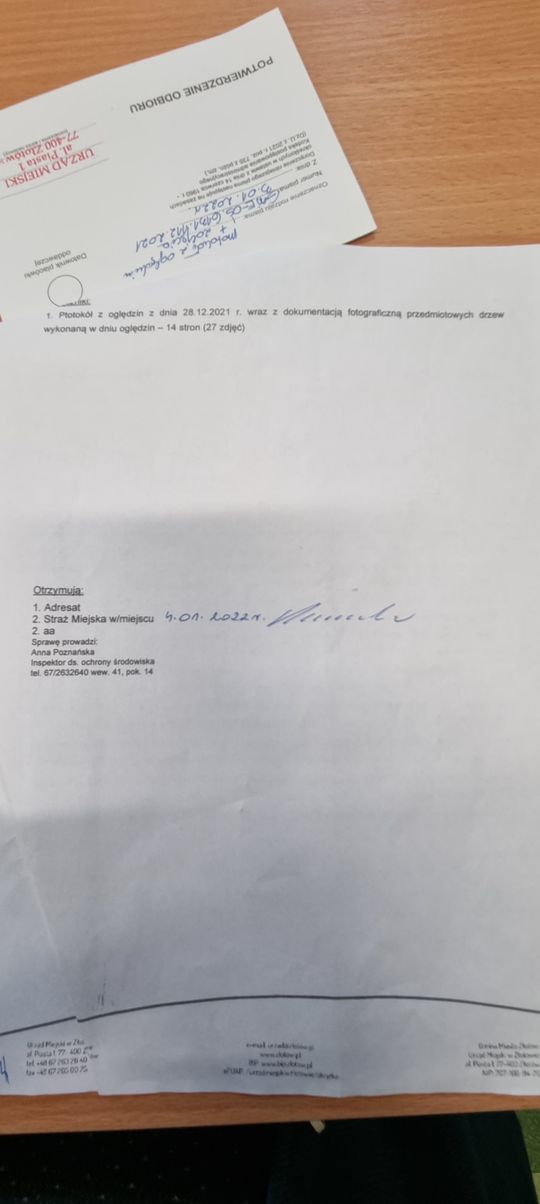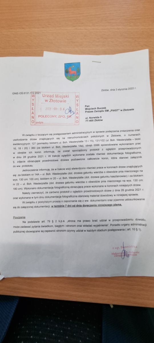 W wyniku prac pielęgnacyjnych przeprowadzonych na drzewach rosnących na działce nr 127, 131/102 i 360, obręb 0088, na terenie SPÓŁDZIELNI MIESZKANIOWEJ PIAST w Złotowie, drzewa zostały całkowicie pozbawione korony - usunięto gałęzie w wymiarze przekraczającym 50% korony, która rozwinęła się w całym okresie rozwoju drzewa. Pozostawiono pień i konary szkieletowe. Usunięte gałęzie nie były obumarłe lub nadłamane, usunięcie gałęzi nie stanowiło utrzymania uformowanego kształtu korony drzewa ani nie wiązało się z wykonaniem specjalistycznego zabiegiem mającym na celu utrzymanie statyki drzewa. Zgodnie z art. 87a ust.5 ustawy o ochronie przyrody na wykonawcy pielęgnacji ciąży obowiązek udowodnienia (dokumentacja fotograficzna), że zastosowane cięcia uzasadnione były trzema powyższymi sytuacjami. Zastosowane cięcia stanowią zaprzeczenie pielęgnacji drzew opartej na wiedzy oraz doświadczeniu dendrologicznym i arborystycznym.