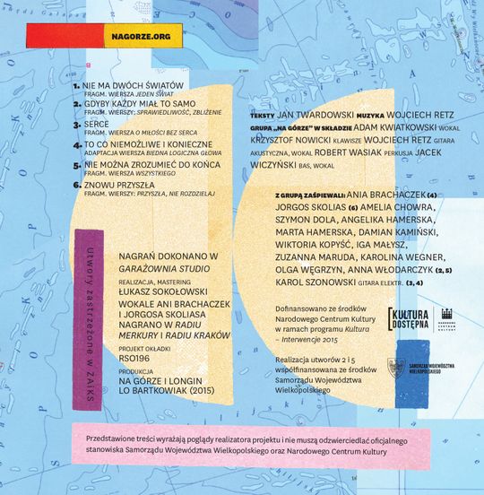 Nagranie czterech utworów i wydanie płyty "NA GÓRZE / TWARDOWSKI - Nie ma dwóch światów" jest dofinansowane ze środków Narodowego Centrum Kultury w ramach programu Kultura - Interwencje 2015. Na płycie znajdą się dodatkowo dwa utwory nagrane dzięki wsparciu Samorządu Województwa Wielkopolskiego.