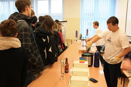 Nie zabrakło więc pokazów laserowych na ciałach stałych i lasera gazowego; przekazywania informacji za pomocą światła i pokazów zjawisk fosforescencji - co nawiązywało do obchodów Międzynarodowego Roku Światła. Prof. Stanisław Różański ze studentami, tłumaczył także, jak można wyznaczyć prędkość dźwięku; czym jest dynamika cieczy, lewitacja magnetyczna i co pływa w kropli wody.