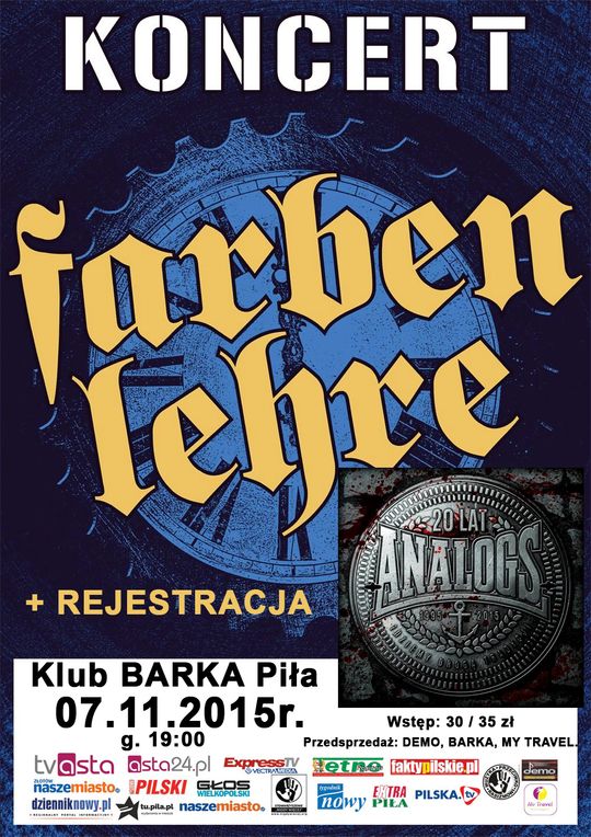(2006,2008), Nie zabijaj (2005-06), Basowiszcza (2007, 2012), Slavske-Rock-Fest (Ukraina 2007,2008,2010), Force Attack (Niemcy 2010) oraz Spirit From the Street (Niemcy 2010, 2013). Za granicą występowali również w Dublinie (Irlandia 2007), Berlinie, Monachium, Hamburgu, Dreźnie czy Magdeburgu (Niemcy 2006-14), Wiedniu (Austria 2009) Kijowie, Lwowie (Ukraina 2007), Sninie,Terchovej, Bratysławie (Słowacja 2013), Auxerre (Francja 2002),Harrachovie, Pradze (Czechy 2012-13) i ostatnio w Londynie, Birmingham czy Leeds (Anglia 2014). W 1998 roku muzycy zagrali dużą trasę koncertową we Włoszech (m.in. Mediolan, Padwa, Genua, Wenecja i Bergamo). Ponadto pojawili się na Białorusi (1988) oraz dwukrotnie byli gościem Flingern Punk Rock Festival w Düsseldorfie (2001, 2003). W latach: 1996, 2004, 2006 i 2013 grupa zaprezentowała się na dużej scenie największej polskiej imprezy, czyli Przystanku Woodstock, dając koncerty dla blisko trzystutysięcznej widowni. W latach 2011 i 2012 gościła na scenie Krs’hna „Woodstocku” .Na swoim koncie kapela ma występy u boku takich formacji jak TheExploited, Die Toten Hosen, G.B.H., Vibrators, U.K.Subs, Anthrax, Dritte Wahl, Rasta Knast, Scarface, Ine Kafe, Kozak System, Normahl, Slobodna Europa czy Smola a Hrusky. Od 1994 roku zespół był pomysłodawcą oraz jednym z wykonawców wiosennej, trasy koncertowej Punky Reggae live, która rokrocznie odwiedzała kilkadziesiąt dużych klubów w całej Polsce. 11 września 2012 roku zespół opublikował studyjny album zatytułowany "Achtung 2012", zarejestrowany w warszawskim studio Serakos. Z kolei w połowie grudnia 2013 światło dzienne ujrzała płyta "Projekt PUNK", będąca zbiorem 20 klasyków z kręgu polskiego punk-rocka. Muzyka FARBEN LEHRE jest energiczna, melodyjna, pełna radości grania i wolna od kompleksów. Ostre, aczkolwiek przystępne dźwięki oraz garść szczerych słów stanowią próbę duchowego porozumienia się z drugim człowiekiem. Najważniejsze utwory FL: "Kolory" "Anioły i demony", "Helikoptery", "Handel""Egoiści", "Nierealne ogniska", "Matura", "Rozkołysanka", "Judasz", "Terrorystan","Pogodna", "Spodnie z GS-u" "Corrida","Erato", "Ferajna" czy "Kolory".