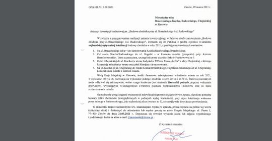 Zgodnie z obowiązującym prawem, zadania uchwalane przez Radę Miejską w Złotowie powierza się do wykonania Burmistrzowi Miasta. Włodarz Złotowa ma więc niewielkie pole manewru. Zanim jednak przystąpił do realizacji inwestycji wystosował 9 marca 2021 roku pismo do mieszkańców. Poniżej jego treść: